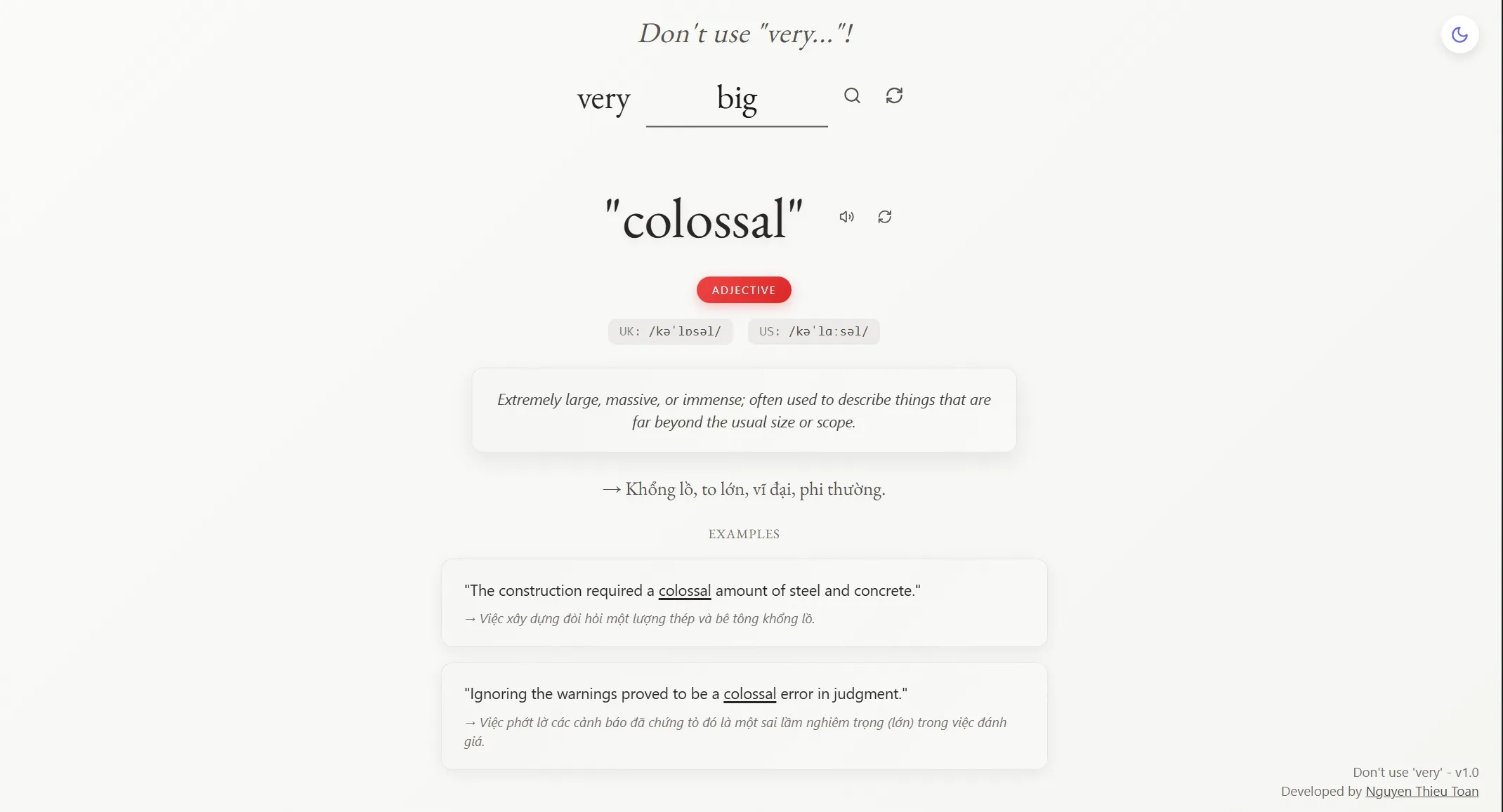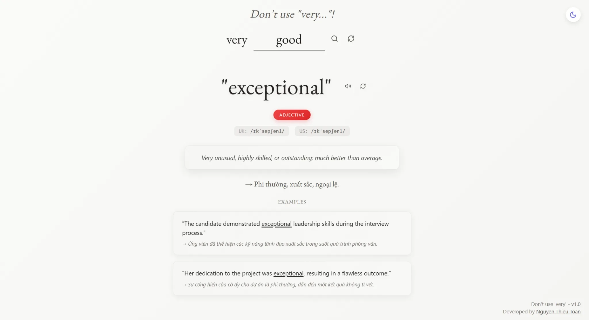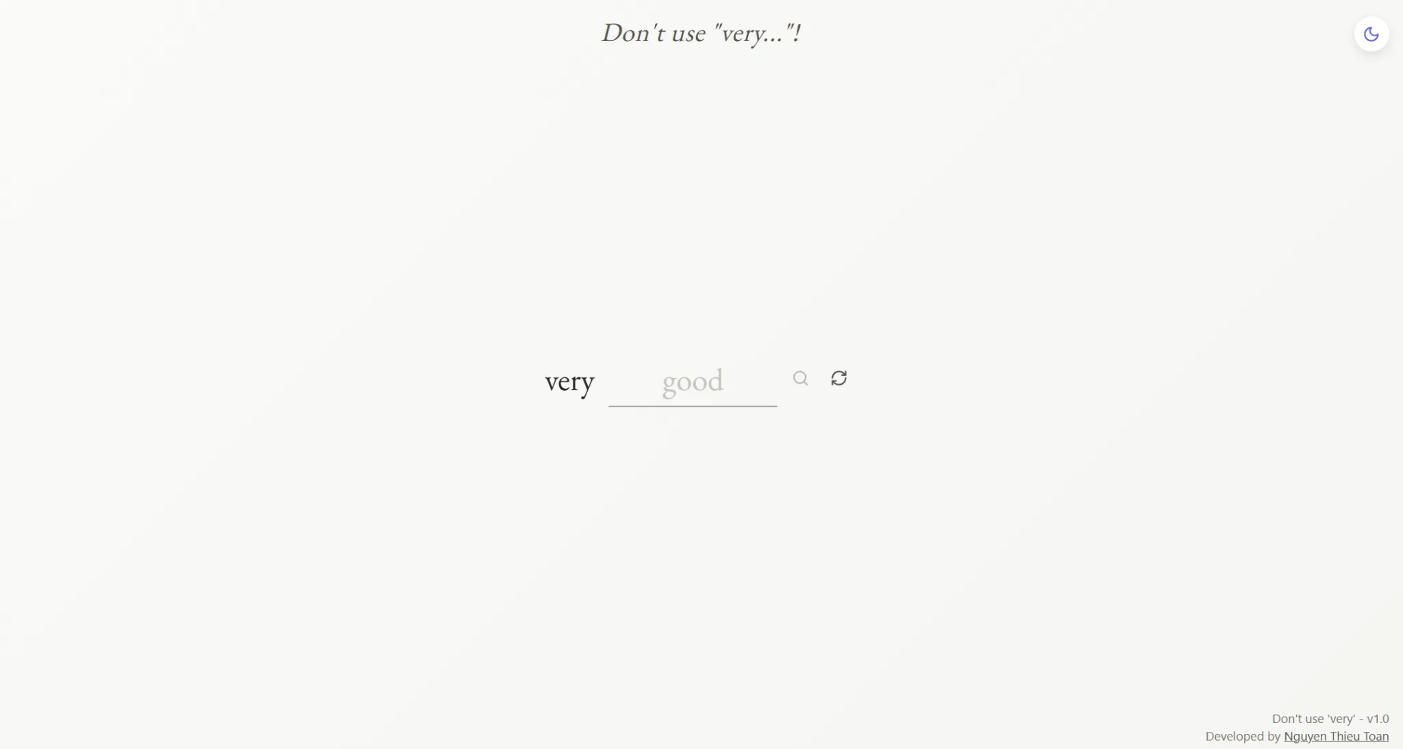 Nhập một tính từ (ví dụ: "good", "bad", "happy"...) vào ô trống bên cạnh chữ "very", hệ thống sẽ tự động tạo ra một từ gần nghĩa nhưng cao cấp hơn.