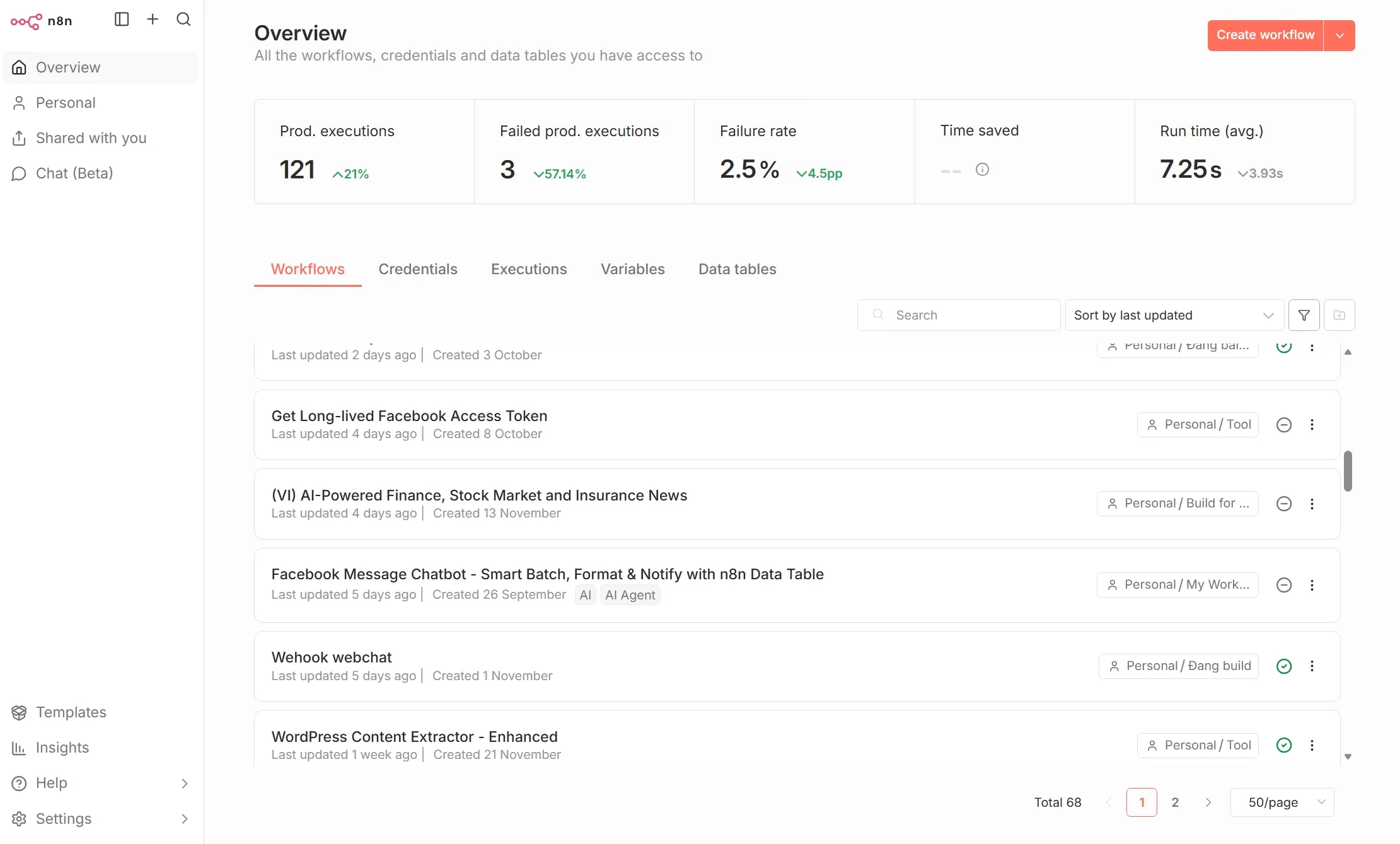 Nơi hiển thị thông tin tổng quan về tài khoản của bạn: số lượng workflow đang chạy, các execution gần đây, và các cảnh báo lỗi nếu có. Đây là “bảng điều khiển” giúp bạn nắm bắt nhanh tình trạng hệ thống.