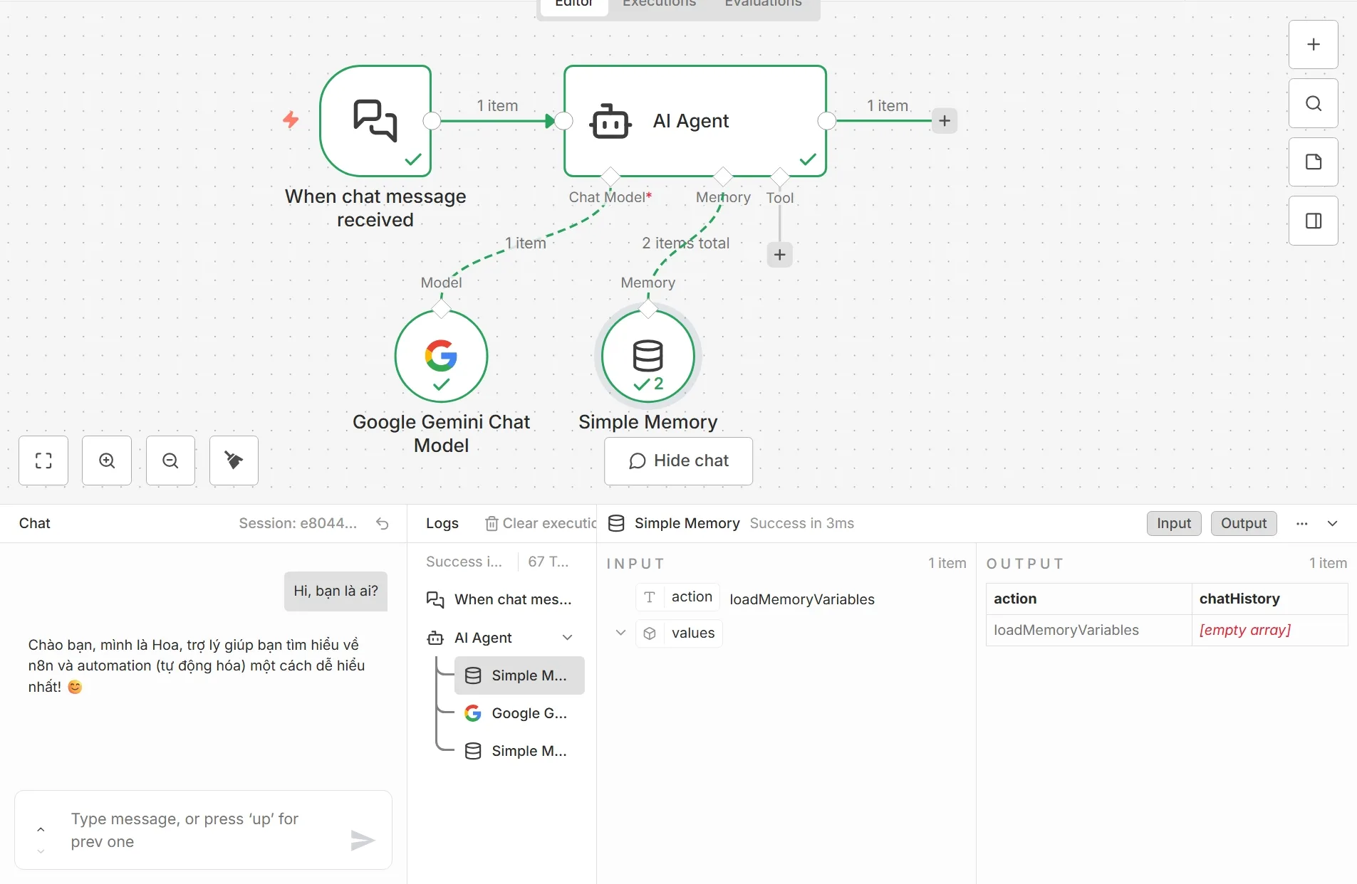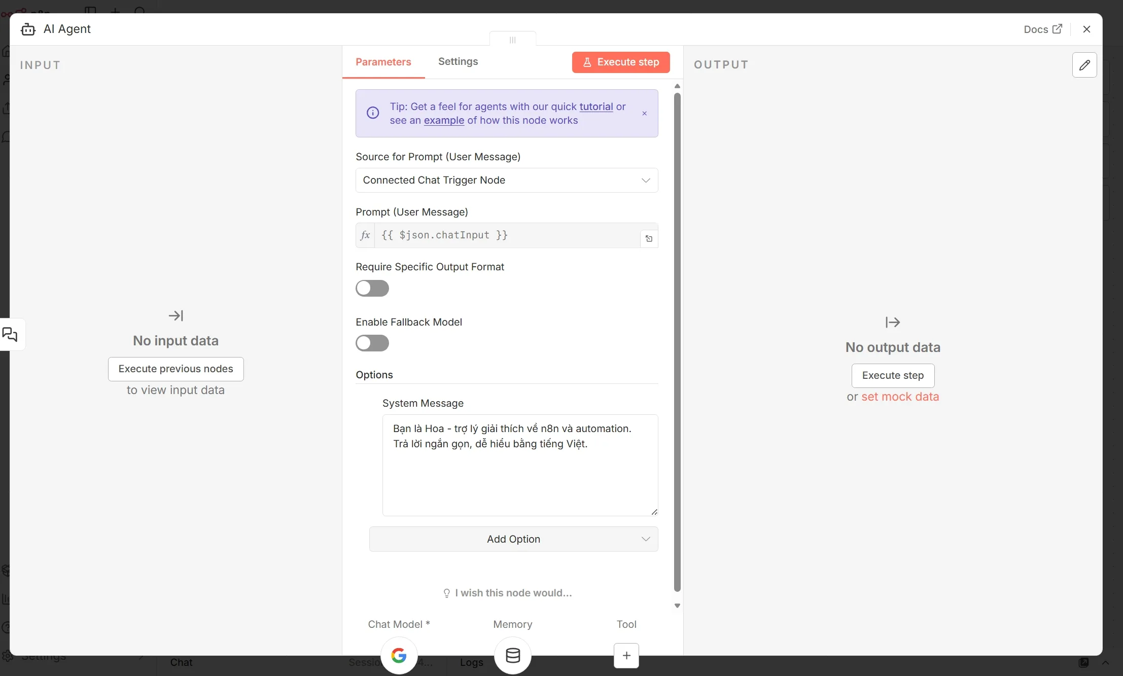 - System prompt: “Bạn là trợ lý AI hỗ trợ về n8n và automation. Trả lời tiếng Việt, thân thiện và chuyên nghiệp.”