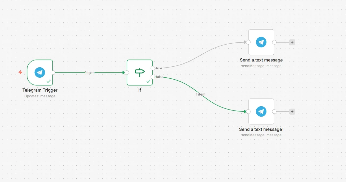 Nhánh False: Tương tự, có thể thử thêm node Telegram “Send message” khác, cài đặt tương tự nhưng để tin nhắn trả về là “Tạm biệt”.