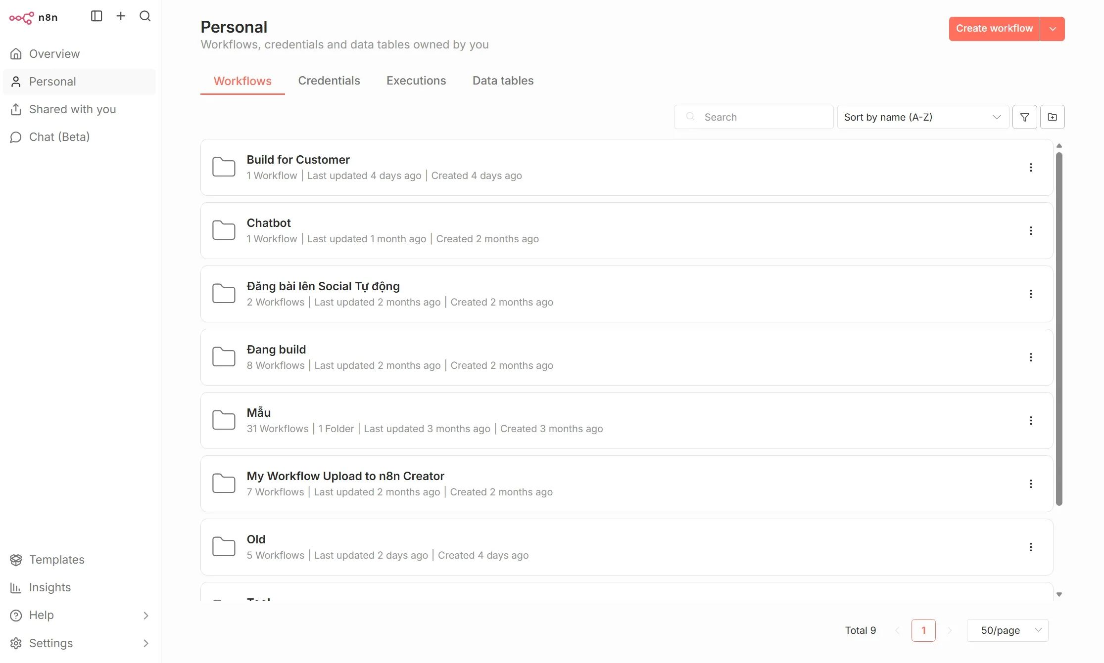 - Workflows: Danh sách tất cả các workflow (quy trình tự động) bạn đã tạo. Mỗi workflow là một “con robot” thực hiện một nhiệm vụ cụ thể. Bấm “Add workflow” để tạo mới.