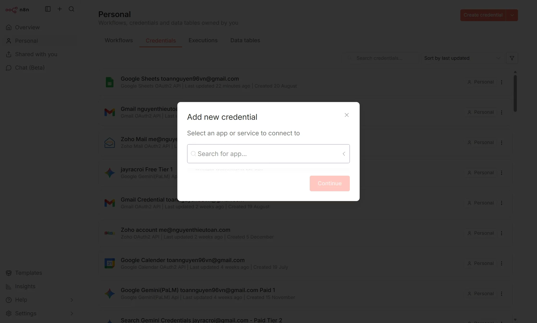 - Credentials: Nơi lưu trữ an toàn các thông tin đăng nhập, API key để kết nối với các dịch vụ bên ngoài (Google, Facebook, Telegram, v.v.). Bạn chỉ cần nhập thông tin xác thực một lần ở đây, sau đó có thể dùng lại cho nhiều workflow khác nhau.