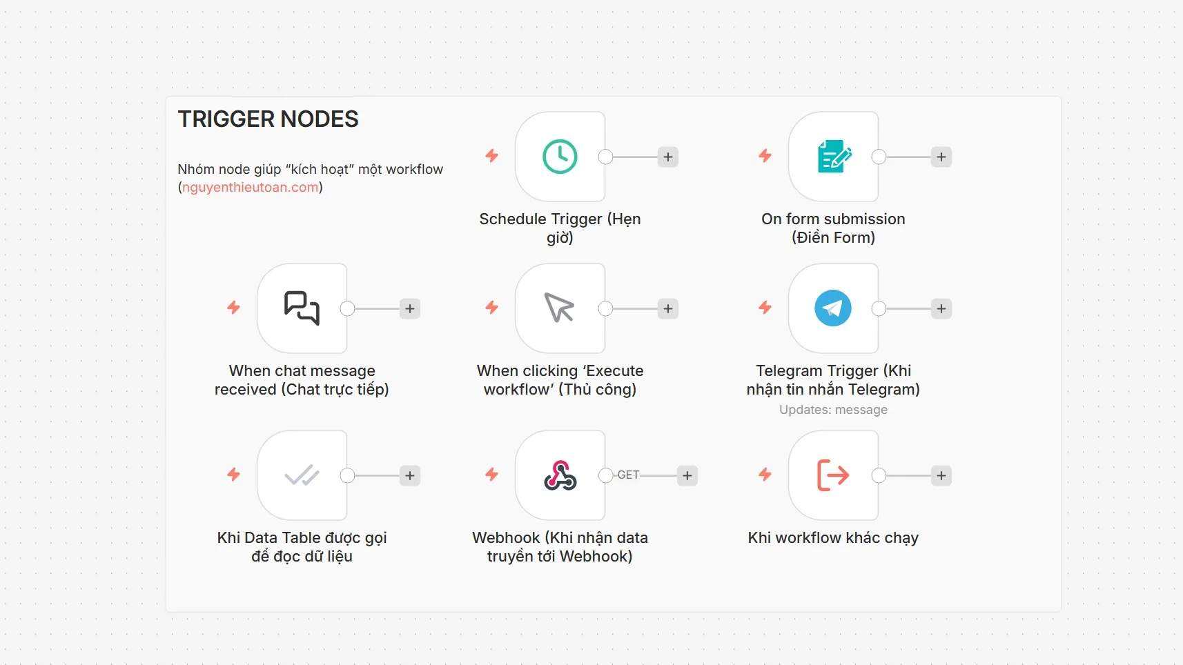 Trigger (Các node để “Kích hoạt” – điều kiện bắt buộc để khởi động workflow)