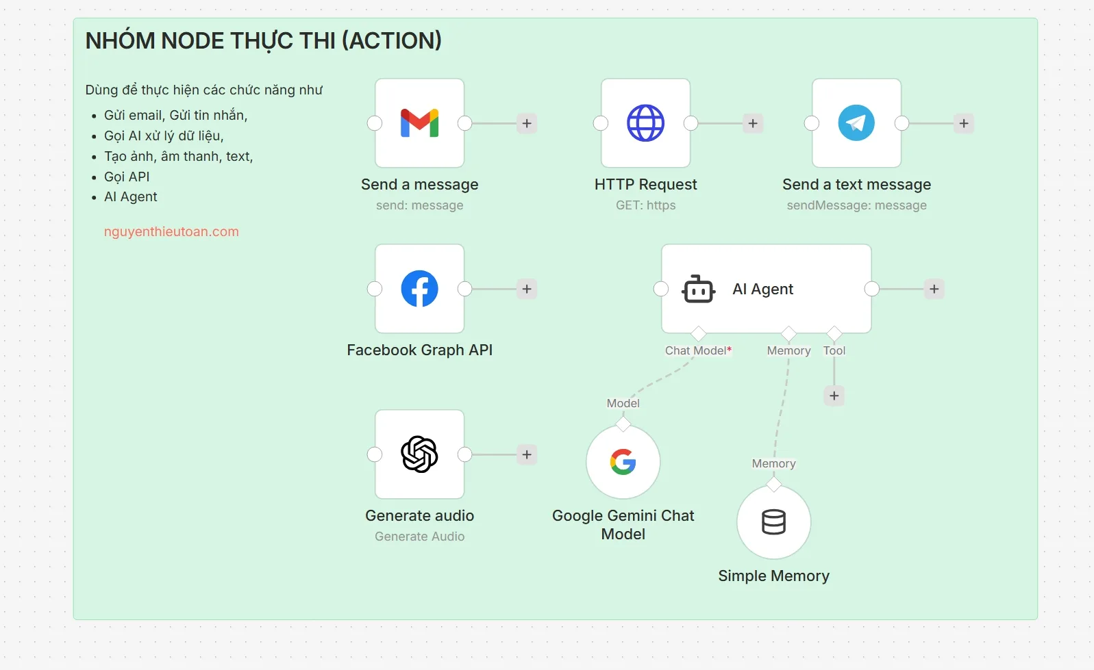 Các node có chức năng thực hiện các công việc cụ thể: gửi email, gửi tin nhắn, ghi file, đăng bài lên mạng xã hội, gọi API, v.v.